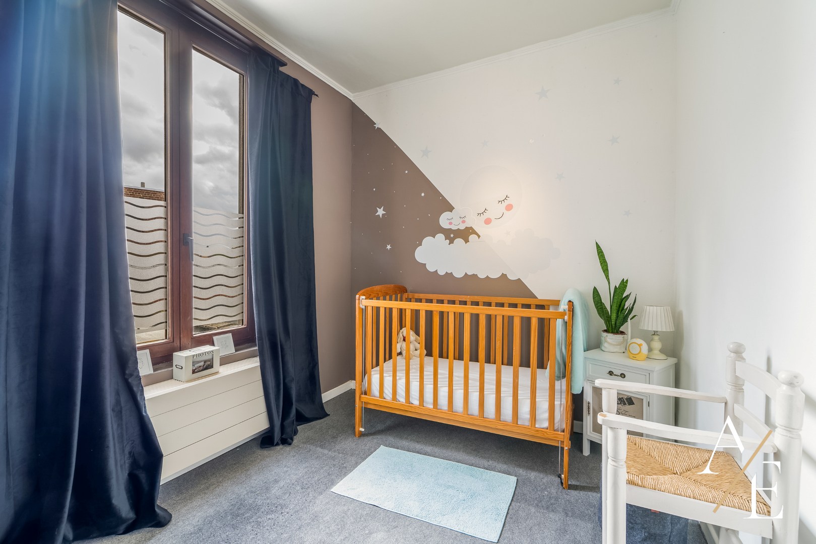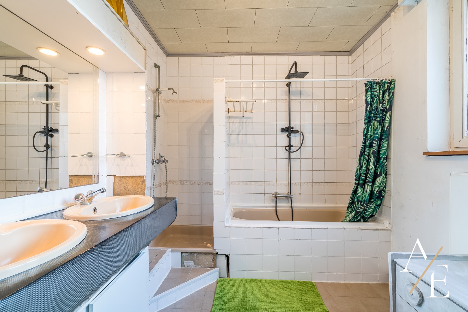 - Het gelijkvloers betreft de inkomhal, een toilet, de inpandige garage, de eetplaats met aansluitend een uiterst gezellige aparte woonkamer, de volledig uitgeruste keuken én een zithoek om te "chillen". - De eerste verdieping telt 4 slaapkamers, de badkamer, het toilet, de badkamer met bad/douche.