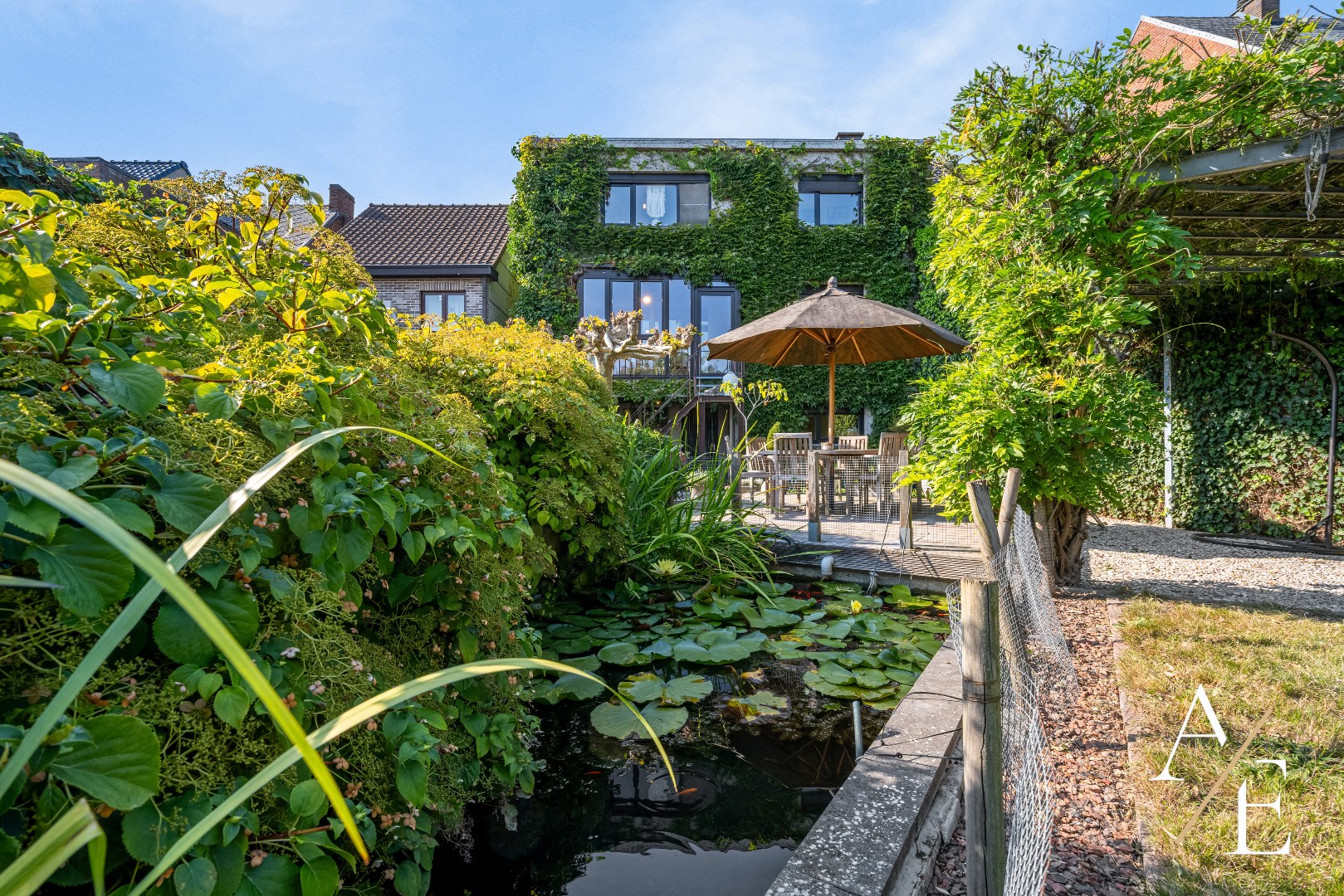 De eerste verdieping heeft een heel gezellige woonkamer met de eetplaats. De praktische keuken is een bijzondere plek in combinatie met het inpandige terras welke een mooie verbinding teweeg brengt met de prachtig aangelegde tuin met vijver op de achtergrond.